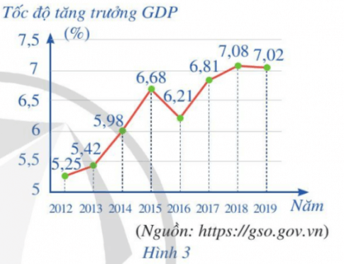 Biểu đồ đoạn thẳng ở Hình 3 biểu diễn tốc độ tăng trưởng GDP của Việt Nam giai đoạn 2012 – 2019.