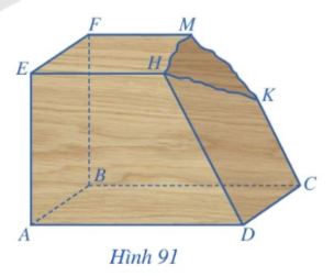 Một khối gỗ có các mặt đều là một phần của mặt phẳng với (ABCD) \parallel\(\parallel\) (EFMH), CK \parallel\(\parallel\) DH. Khối gỗ bị hỏng một góc (Hình 91). Bác thợ mộc muốn làm đẹp khối gỗ bằng cách cắt khối gỗ theo mặt phẳng (R) đi qua K và song song với mặt phẳng (ABCD).