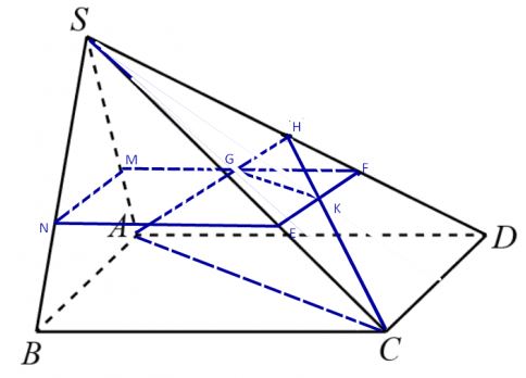 b) Mặt phẳng chứa đường thẳng GK và song song với mặt phẳng (ABCD) cắt các cạnh SA, SB, SC, SD lần lượt tại M, N, E, F. Chứng minh rằng tứ giác MNEF là hình bình hành.