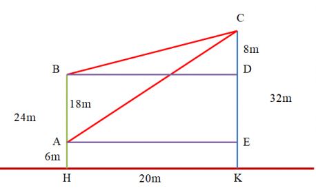 Có hai chung cư cao tầng xây cạnh nhau với khoảng cách giữa chúng là HK = 20 m. Để đảm bảo an ninh, trên nóc chung cư thứ hai người ta lắp camera ở vị trí C. Gọi A, B lần lượt là vị trí thấp nhất, cao nhất trên chung cư thứ nhất mà camera có thể quan sát được (Hình 18). Hãy tính số đo góc ACB (phạm vi camera có thể quan sát được ở chung cư thứ nhất). Biết rằng chiều cao của chung cư thứ hai là CK = 32 m, AH = 6 m, BH = 24 m (làm tròn kết quả đến hàng phần mười theo đơn vị độ).