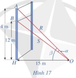 Một sợi cáp R được gắn vào một cột thẳng đứng ở vị trí cách mặt đất 14 m. Một sợi cáp S khác cũng được gắn vào cột đó ở vị trí cách mặt đất 12 m. Biết rằng hai sợi cáp trên cùng được gắn với mặt đất tại một vị trí cách chân cột 15 m (Hình 17).