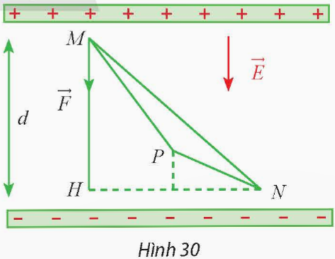 \(\overrightarrow{F\ }\) tác động lên điện tích điểm M trong điện trường đều làm cho M dịch chuyển theo đường gấp khúc MPN (Hình 30). Biết q = 2 . 10- 12 C, vectơ điện trường có độ lớn E = 1,8 . 105 N/C và d = MH = 5 mm. Tính công A sinh bởi lực tĩnh điện