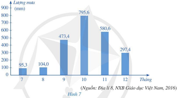 Biểu đồ ở Hình 7 biểu diễn lượng mưa tại trạm khí tượng Huế trong sáu tháng cuối năm dương lịch.
