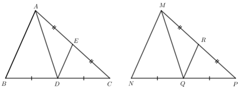 : Cho ∆ABC = ∆MNP. Gọi D, E lần lượt là trung điểm của BC và CA; Q, R lần lượt là trung điểm của NP và PM. Chứng minh: