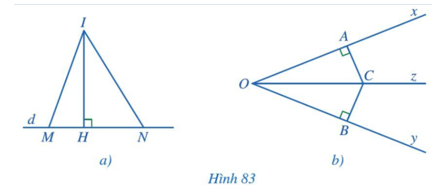 Chỉ ra các đường vuông góc, các đường xiên kẻ từ điểm I trong Hình 83a và từ điểm C trong Hình 83b.
