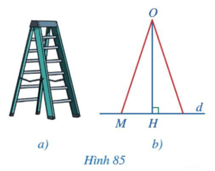 Hình 85b mô tả mặt cắt đứng của một chiếc thang chữ A (Hình 85a), trong đó độ dài của một bên thang được tính bằng độ dài đoạn thẳng OM, chiều cao của chiếc thang được tính bằng độ dài đoạn OH, với H là hình chiếu của điểm O trên đường thẳng d. Một người sử dụng thang này có thể đứng ở độ cao 4 m hay không nếu độ dài của một bên thang là 3,5 m? Vì sao?