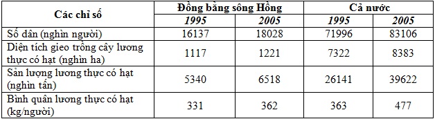 Số dân, diện tích gieo trồng, sản lượng và bình quân lương thực có hạt theo đầu người của Đồng bằng sông Hồng và cả nước trong giai đoạn 1995 – 2005