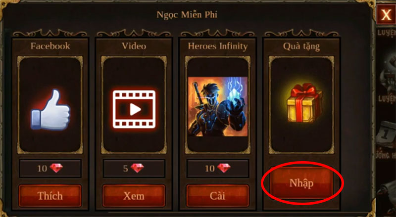 Trong danh sách ngọc miễn phí, các bạn kéo hết sang trái để thấy phần Quà tặng. Nhấn nút Nhập.