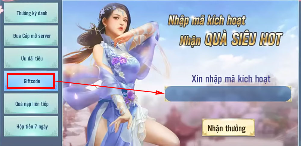 Trong bảng hiện ra, chọn tab Giftcode sau đó nhập mã kích hoạt vào ô trống. Nhập xong các bạn nhấn nút Nhận thưởng phía dưới.