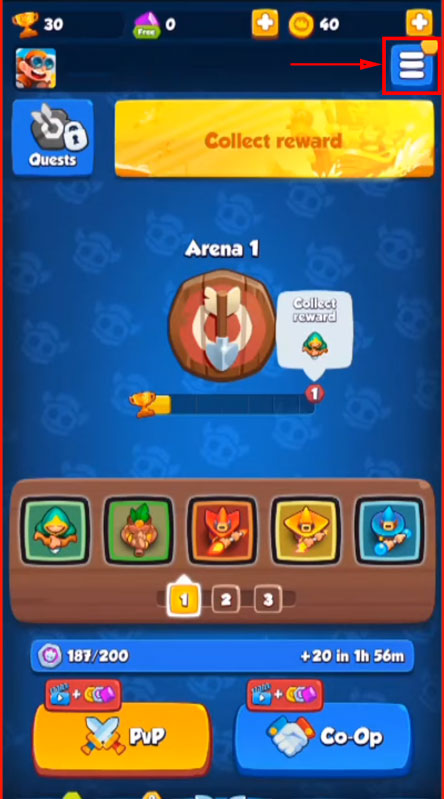 Để nhập mã giftcode, đầu tiên các bạn mở game Rush Royale lên. Ở màn hình chính, nhấn chọn nút menu ở góc trên bên phải.