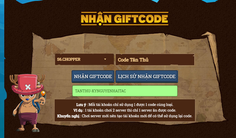 Để nhận code Kỷ Nguyên Hải Tặc ở giai đoạn game mới ra mắt này rất đơn giản. Các bạn chỉ cần truy cập vào trang: https://kynguyenhaitac.vn/giftcode. Ở màn hình các bạn chọn server (máy chủ) và loại code sau đó nhấn nút Nhận Giftcode.