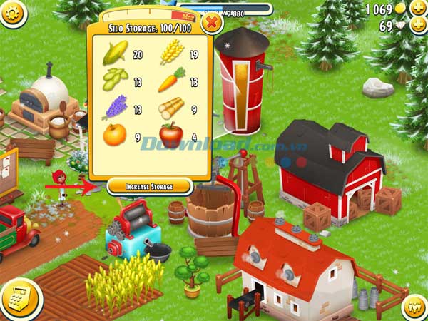 Để nâng cấp silo và chứa được nhiều hoa màu hơn, bạn cần tới đinh, cưa và ván gỗ. Chúng được tìm thấy trong chiếc hộp bí mật màu đỏ, hoặc mua từ quầy hàng ven đường của người chơi khác, đôi khi là do bạn kiếm được từ bánh xe may mắn hay chính từ mùa vụ thu hoạch.