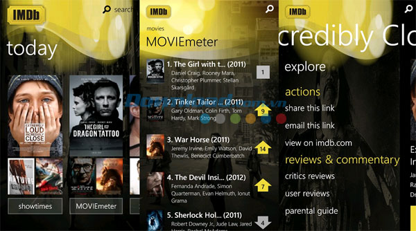 IMDb là kho phim khổng lồ trên di động, nơi bạn có thể xem thời gian phát sóng các show truyền hình nổi tiếng, trailer phim mới, xem ảnh, danh sách phim đề cử và bình chọn cho những chương trình mà mình yêu thích. Có thể nói, IMDb là bộ sưu tập khổng lồ về phim, tivi và thông tin người nổi tiếng. Dữ liệu và thông tin liên quan tới lĩnh vực phim ảnh được cập nhật hàng ngày và liên tục.