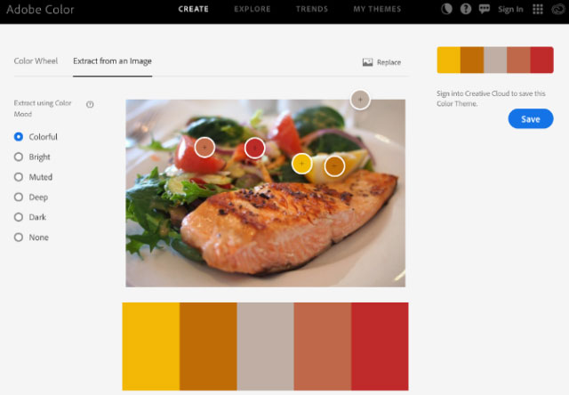 Cách 2 là nếu bạn thích màu nào đó trên một hình ảnh, hãy tải hình lên Adobe Color. Theo mặc định nó sẽ chọn ra màu sắc nổi bật nhưng bạn có thể nhấp vào bất cứ đâu trên hình ảnh đề chọn màu mình muốn sao chép.