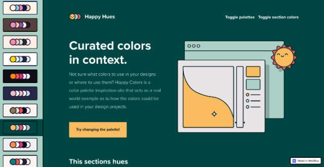 Happy Hues là một công cụ tuyệt vời đến chọn màu cho trang web. Nó cho bạn thấy một bản demo trực tiếp của trang web bằng cách cập nhật màu mới cho web mỗi khi bạn chọn bảng màu.