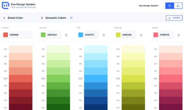 Trí tuệ nhân tạo trong EVA Design System có thể đảm nhận công việc chọn và phối màu cho bạn. Chọn 1 màu và nó sẽ tạo ra một bảng màu với 4 phản ứng cảm xúc: Thành công, Thông tin, Cảnh báo và Nguy hiểm. Sau đó sao chép mã hóa Hex hoặc xuất toàn bộ dưới dạng JPEG hoặc JSON.