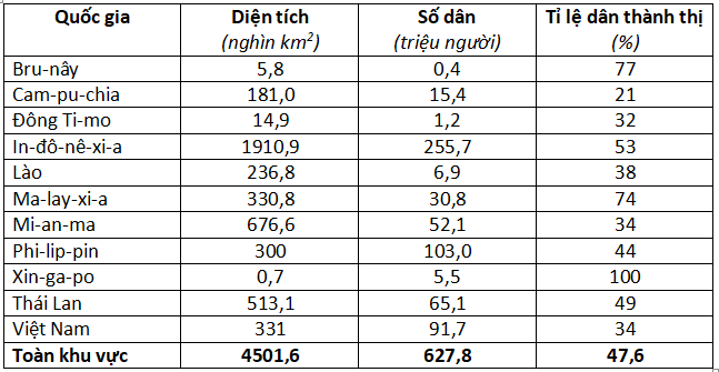Câu 20. Diện tích và số dân của Việt Nam lần lượt chiếm tỉ lệ phần trăm trong tổng diện tích và số dân khu vực Đông Nam Á năm 2015 là