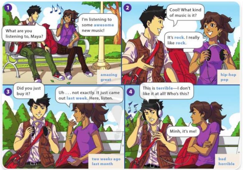 Meg: Sorry, Chris, but can you change the music? I can’t stand it. Chris: Sure. I have other kinds of music. Which do you like better, (1)________ or (2)_______( types of music) Meg: Sorry, I don’t really like either of them Chris: Okay, what kind of music do you like best? Meg: I guess I like pop best. Chris: Then how about (3)__________? ( singer/band). Do you like_____(4)?( him/her/them) Meg: Oh, I love(5)__________! ( him/her/them)