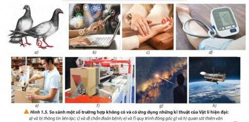 Quan sát hình 1.5 và phân tích ảnh hưởng của vật lý trong một số lĩnh vực. Từ đó trình bày ưu điểm của việc ứng dụng vật lý vào đời sống so với các phương pháp truyền thống ở các lĩnh vực trên