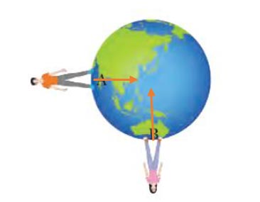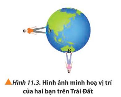 Hai bạn đang đứng ở vị trí A và B trên Trái Đất như Hình 11.3. Hãy vẽ vecto trọng lực tác dụng lên mỗi bạn.