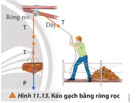 Hình 11.13 mô tả quá trình kéo gạch từ thấp lên cao qua hệ thống ròng rọc. Xem chuyển động của thùng gạch là đều, hãy xác định lực căng dây tác dụng lên vật nâng và ròng rọc bằng hình vẽ. Từ đó hãy chỉ ra điểm đặt, phương, chiều và độ lớn của lực căng dây. Biết lượng gạch trong mỗi lần kéo có khối lượng 20 kg và lấy g = 9,8 m/s2.