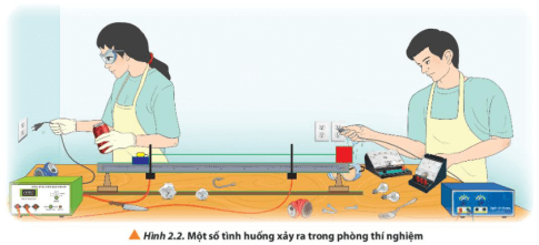 Quan sát Hình 2.2 và chỉ ra những điểm không an toàn khi làm việc trong phòng thí nghiệm.