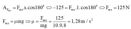 Một vật có khối lượng 10 kg đang chuyển động với tốc độ 5 km/h trên mặt bàn nằm ngang. Do có ma sát, vật chuyển động chậm dần đều và đi được 1 m thì dừng lại. Tính hệ số ma sát giữa vật và mặt bàn. Lấy gia tốc trọng trường g = 9,8 m/s2.
