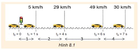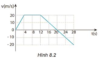 Đồ thị ở Hình 8.2 mô tả sự thay đổi vận tốc theo thời gian trong chuyển động của một ô tô thể thao đang chạy thử về phía Bắc.