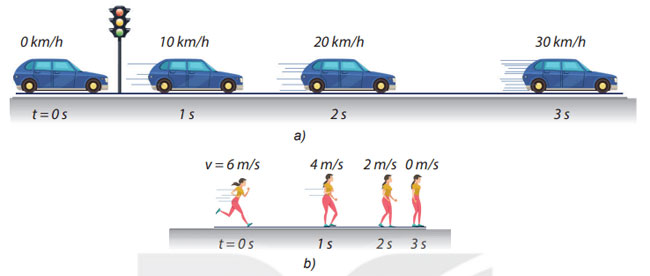 Hình trên mô tả sự thay đổi vị trí và vận tốc của ô tô, người sau những khoảng thời gian bằng nhau. Hai chuyển động này có gì giống nhau, khác nhau.