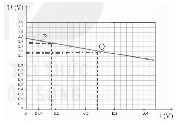Dạng đồ thị của U = f(I) là một đường thẳng. Kéo dài đồ thị cho cắt trục tung U(V). Giao điểm chính là trị số của suất điện động E. Từ đồ thị ta tính được E = 1,31V
