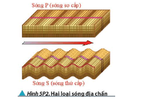 Hình 5P.2 mô tả hai loại sóng địa chấn truyền trong môi trường khi xảy ra động đất sóng P (sóng sơ cấp) và sóng S (sóng thứ cấp). Hãy phân biệt hai sóng địa chấn này thuộc sóng dọc hay sóng ngang. Giải thích.