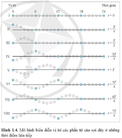 Mô tả chuyển động của phần tử số 0 trên Hình 1.4 trong thời gian từ t = 0 đến t = T. Từ đó, chỉ ra mối liên hệ giữa khoảng thời gian T biểu diễn trong Hình 1.4 với chu kì dao động của phần tử số 0 và với chu kì sóng trên dây.