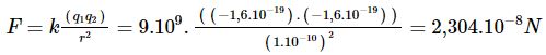 Tính lực tương tác giữa hai electron ở cách nhau 1,0.10-10 m trong chân không. (Điện tích của electron e = -1,6.10-19C)