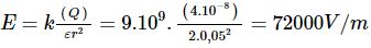 Tính độ lớn và vẽ hướng của cường độ điện trường do một điện tích điểm 4.10-8 C gây ra tại một điểm cách nó 5 cm trong môi trường có hằng số điện môi là 2.