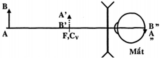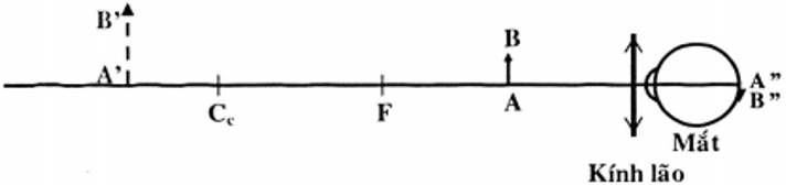 Vật AB cần quan sát gần qua kính sẽ tạo ảnh ảo A’B’ nằm trong khoảng thấy rõ CCCV của mắt người đó. Khi đó mắt sẽ nhìn ảnh A’B này qua thể thủy tinh của mắt cho ảnh A”B” trên màng lưới như hình vẽ: