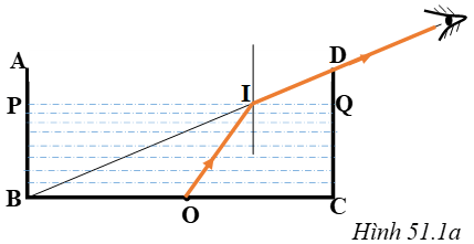 - Vẽ đường thẳng PQ biểu diễn mặt nước sau khi đổ nước vào đường PQ này cắt tia sáng BD đi từ mép của đáy bình đến mắt tại điểm I.