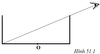 Một bình hình trụ tròn có chiều cao 8cm và đường kính 20 cm. Một học sinh đặt mắt nhìn vào trong bình sao cho thành bình vừa vặn che khuất hết đáy (hình 51.1 SGK trang 135). Khi đổ nước vào khoảng xấp xỉ 2/4 bình thì bạn đó vừa văn nhìn thấy tâm O của đáy. Hãy vẽ tia sáng từ tâm O của đáy bình truyền tới mắt.