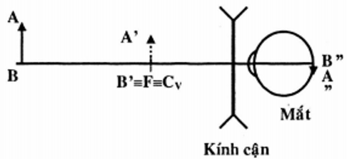 Vật AB cần quan sát ở rất xa (coi như vô cực, khoảng cách từ vật đến kính là d1 = ∞ ) qua kính sẽ tạo ảnh ảo A’B’ nằm tại điểm cực viễn của mắt người đó. Khi đó mắt sẽ nhìn thấy ảnh A’B này mà không cần điều tiết và qua thể thủy tinh của mắt cho ảnh A”B” trên màng lưới như hình vẽ: