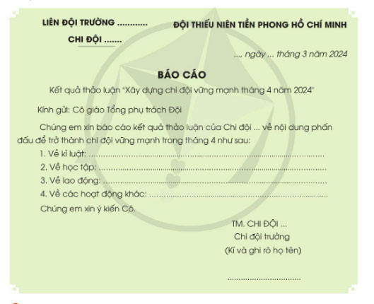 b, Nội dung báo cáo là báo cáo kết quả thảo luận của Chi đội 4A về nội dung phấn đấu để trở thành chi đội vững mạnh trong tháng 4