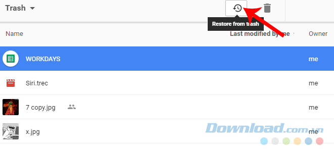 Hoặc cách 2, click chuột trái vào biểu tượng Restore from trash bên trên.