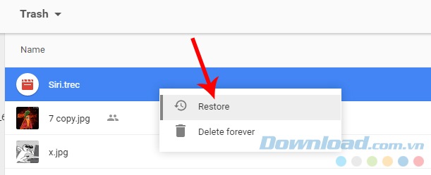 Cách 1: Chuột trái vào file cần phục hồi, tiếp tục chuột phải rồi chọn Restore.