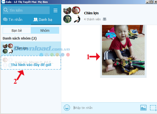 Bạn có thể kéo thả hình ảnh vào danh sách các cuộc trò chuyện, danh sách bạn bè hoặc nhóm để gửi hàng loạt ảnh dễ dàng bằng cách trỏ chuột vào hình ảnh rồi kéo và thả vào khung chat.
