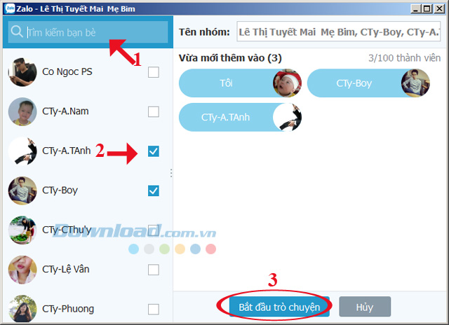 Sau đó, gõ tên bạn bè muốn thêm vào nhóm chat ở mục tìm kiếm góc trên cùng bên trái màn hình, rồi tích chọn vào hộp chọn bên cạnh người muốn thêm đó. Khi đã thêm đủ thành viên vào nhóm thì nhấn nút Bắt đầu trò chuyện ở góc dưới cùng để thoải mái chat chit với các thành viên trong nhóm.