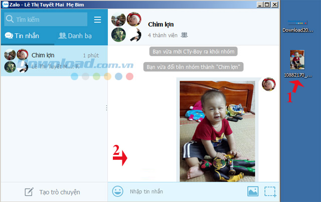 Thú vị hơn là bạn có thể chuyển tiếp hình ảnh ngay trong cửa sổ trò chuyện bằng cách nhấn và di chuột vào hình ảnh muốn chuyển tiếp, rồi kéo và thả hình ảnh vào cửa sổ trò chuyện khác (như hình dưới).