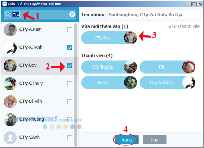 Tiếp theo, gõ tên người muốn thêm vào ô tìm kiếm ở góc trên cùng bên trái màn hình, rồi tích chọn vào hộp chọn bên cạnh thành viên đó. Lúc này, bạn sẽ thấy tên thành viên đó đã được thêm vào nhóm, nhấn nút Xong để hoàn tất.